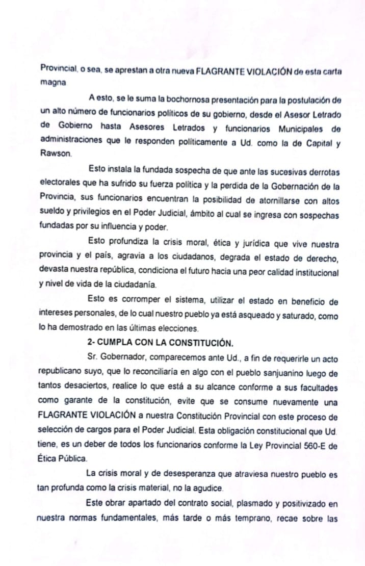 Nota del SUOEM, a través del secretario general Dr Antonino D'Amico y el asesor legal Horario Rodríguez del Cid, dirigida al señor gobernador de la provincia Dr. Sergio Uñac, con respecto a la incorporación y nombramientos de jueces en el Poder Judicial.