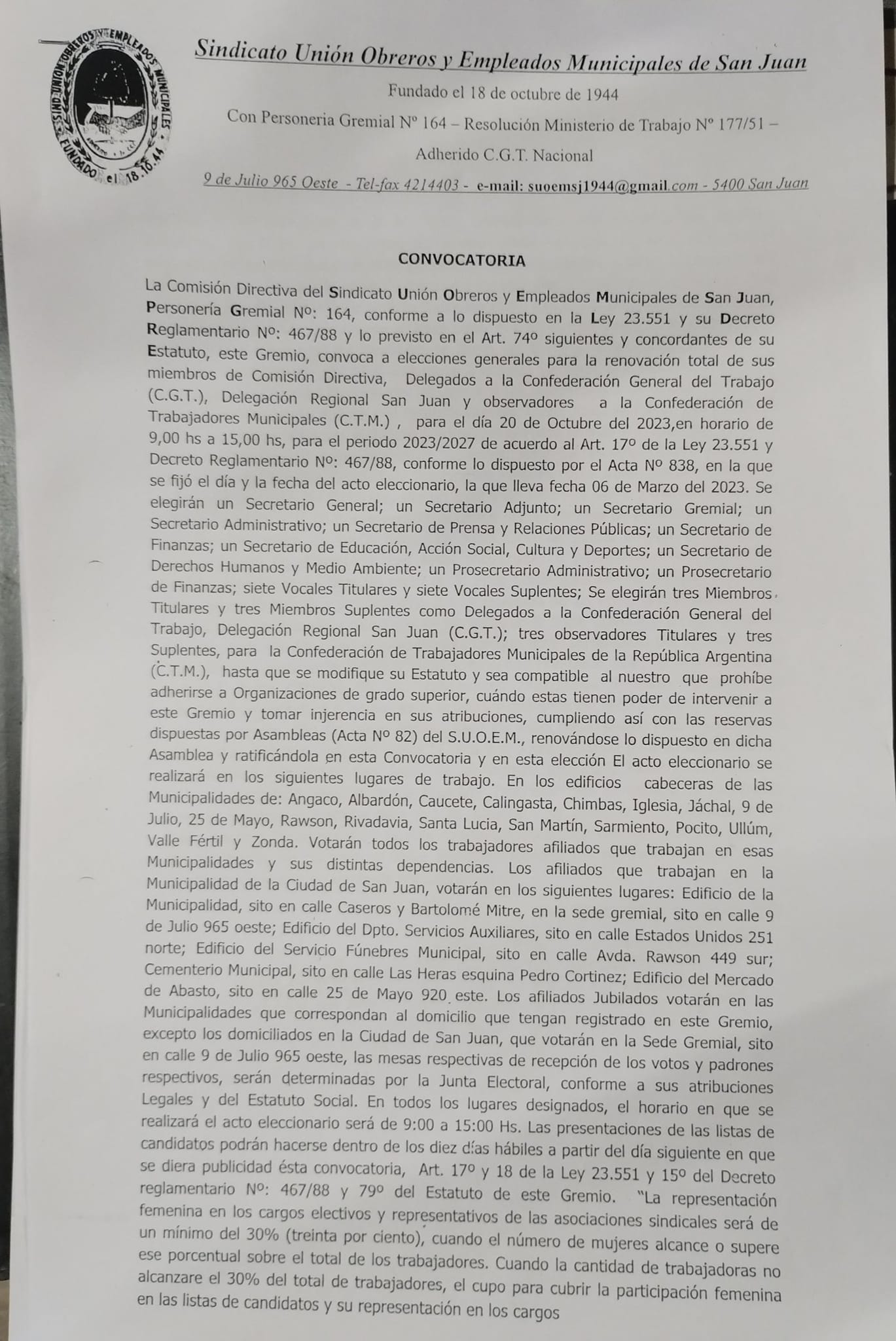 Convocatoria a Elecciones de Autoridades en el Sindicato Unión Obreros y Empleados Municipales de San Juan.