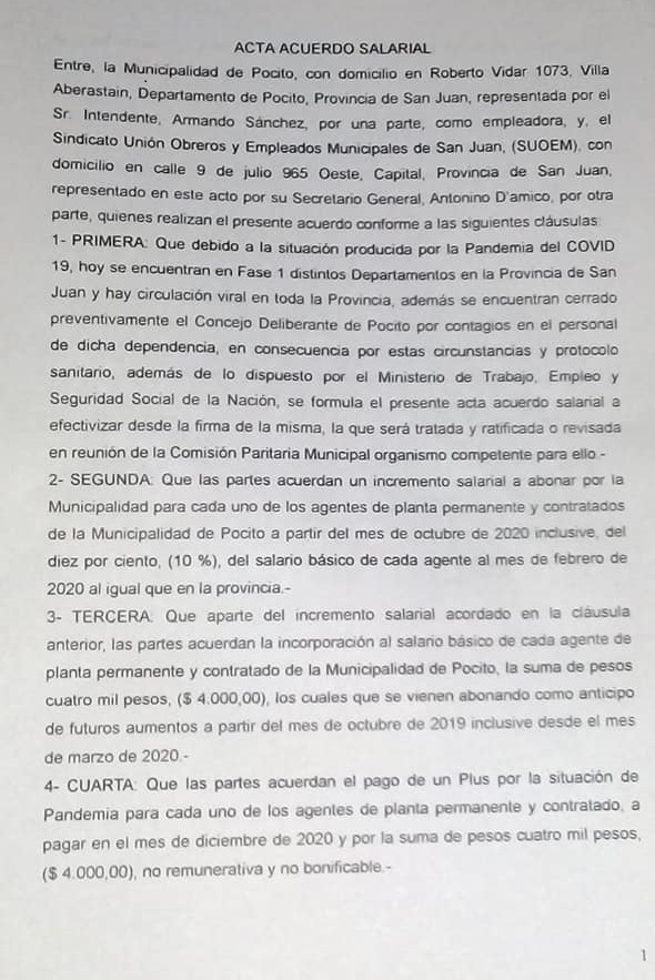 1- PRIMERA: Que debido a la situación producida por la Pandemia del COVID 19, hoy se encuentran en Fase 1 distintos Departamentos en la Provincia de San Juan y hay circulación viral en toda la Provincia, además se encuentran cerrado preventivamente el Concejo Deliberante de Pocito por contagios en el personal de dicha dependencia, en consecuencia por estas circunstancias y protocolo sanitario, además de lo dispuesto por el Ministerio de Trabajo, Empleo y Seguridad Social de la Nación, se formula el presente acta acuerdo salarial a efectivizar desde la firma de la misma, la que será tratada y ratificada o revisada en reunión de la Comisión Paritaria Municipal organismo competente para ello.-