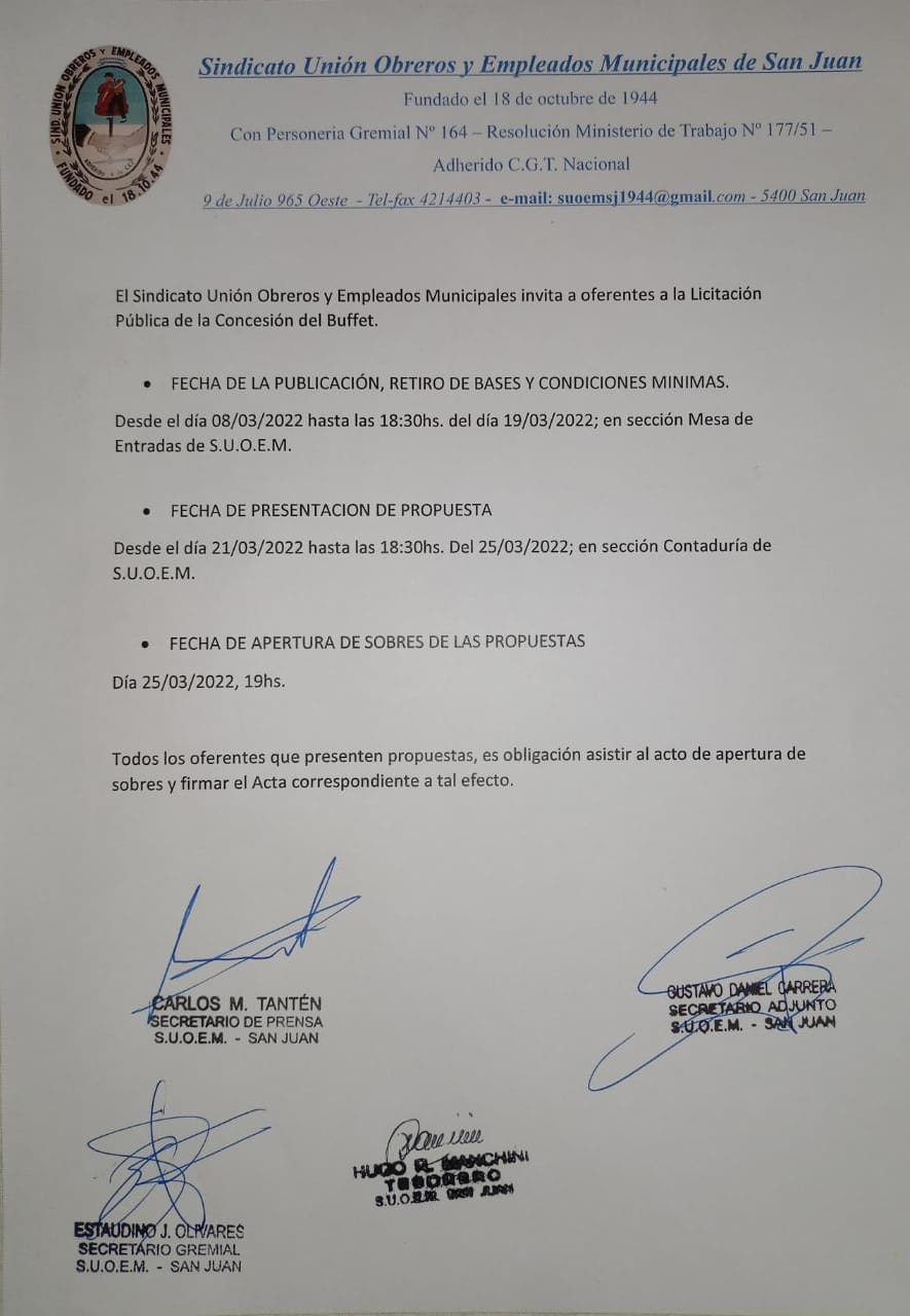El Sindicato Unión Obreros y Empleados Municipales invita a oferentes a la Licitación Pública de la Concesión del Buffet.