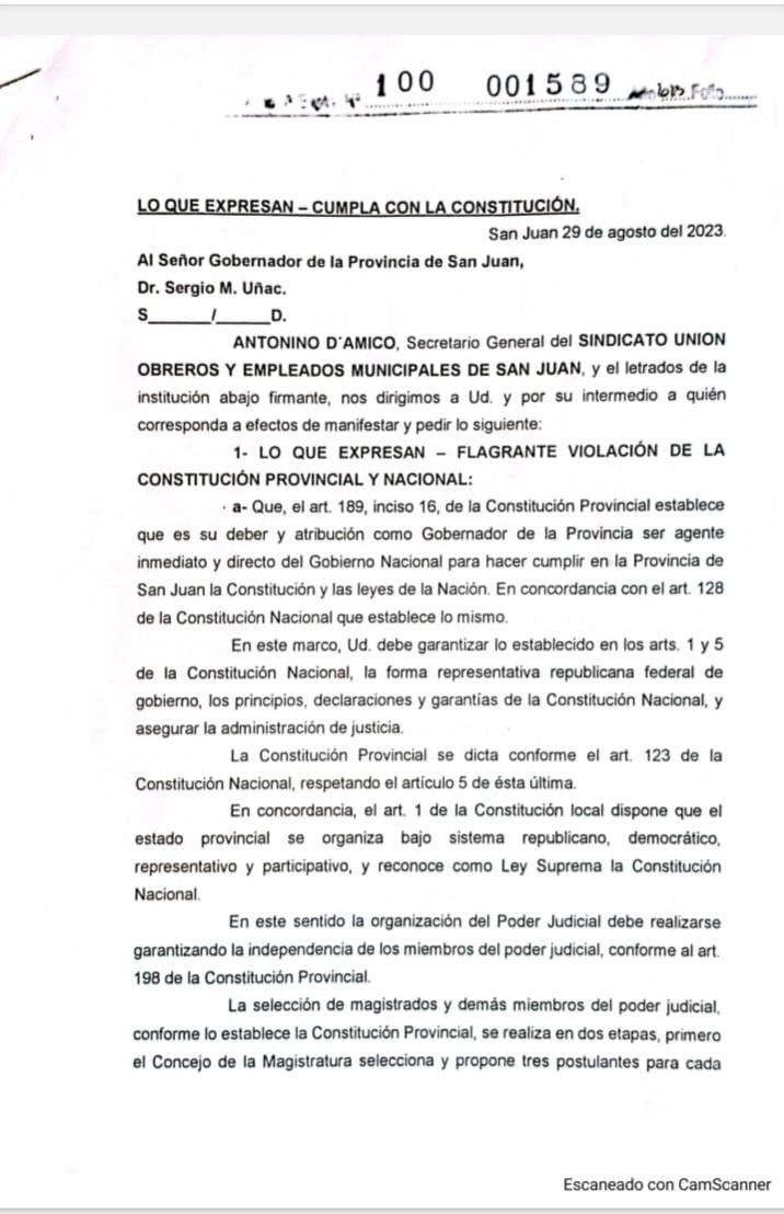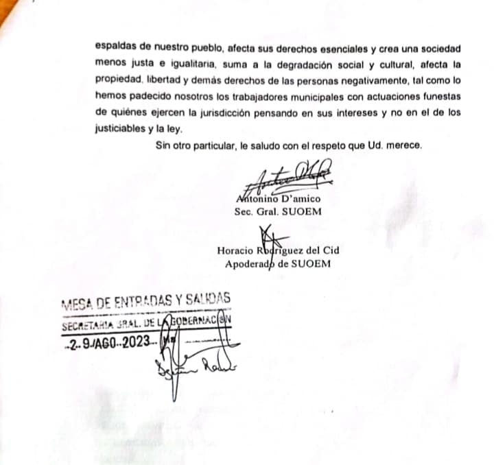Nota de SUOEM dirigida al Dr. Sergio Uñac. 29/08/23