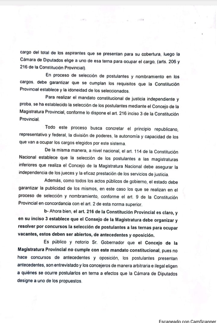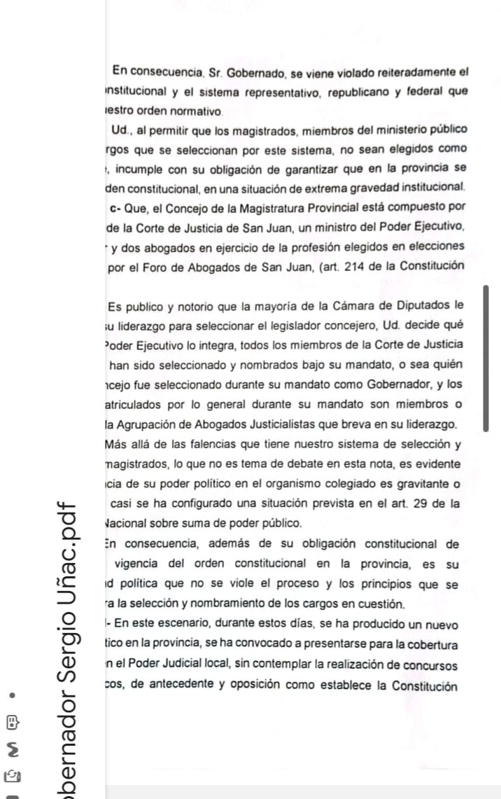 Nota del SUOEM, a través del secretario general Dr Antonino D'Amico y el asesor legal Horario Rodríguez del Cid, dirigida al señor gobernador de la provincia Dr. Sergio Uñac, con respecto a la incorporación y nombramientos de jueces en el Poder Judicial.