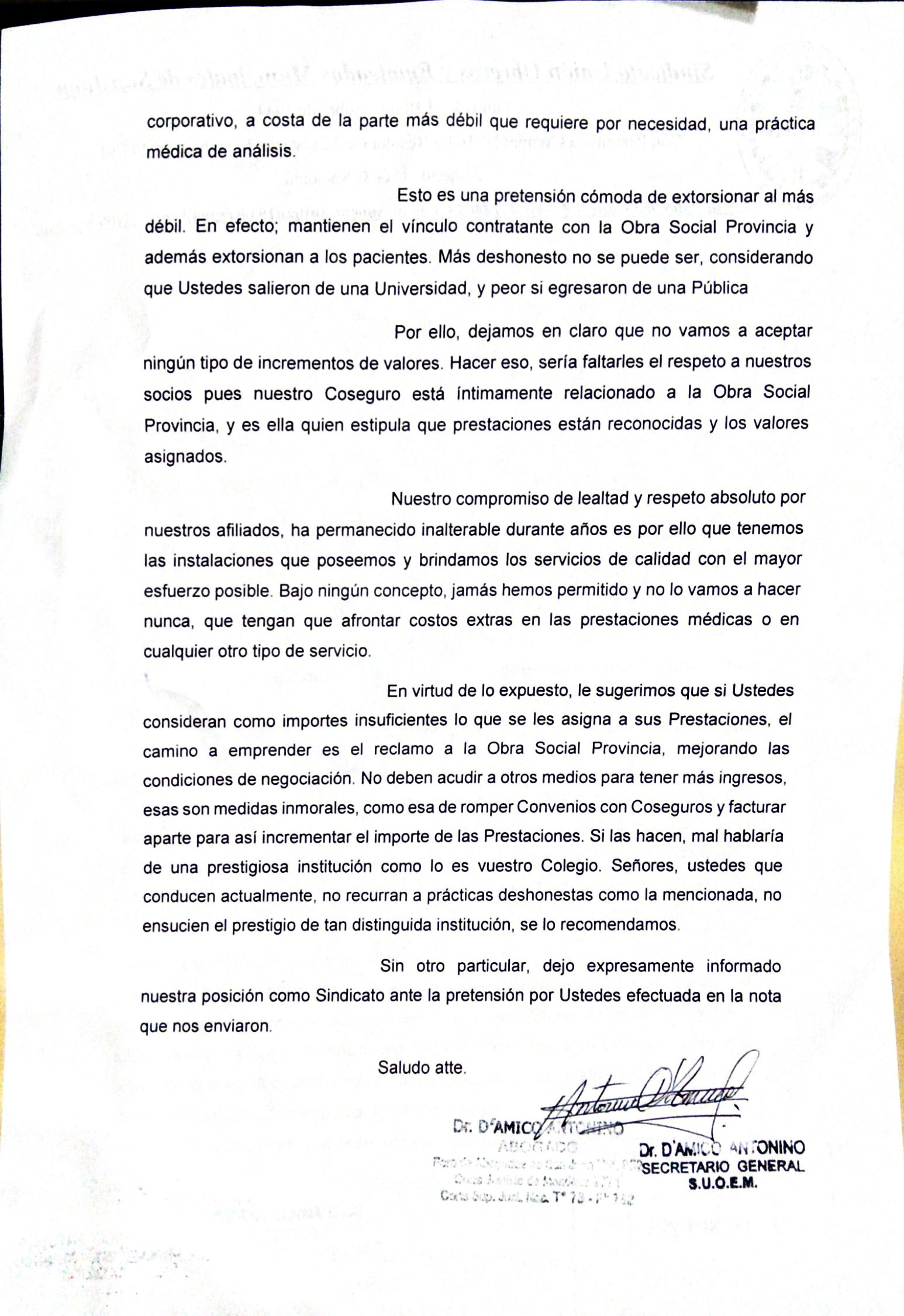 Nota del Secretario General de SUOEM Dr. Antonino D´amico dirigida al Colegio Bioquímico de San Juan.