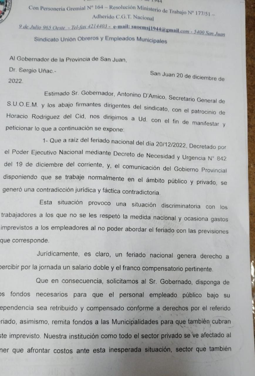 La nota presentada y dirigida al gobernador de la provincia Dr. Sergio Uñac, hace mención al pago que se le debe abonar a todos los trabajadores, especialmente al sector municipal ,por cuánto se trabajo normalmente en un día de Feriado Nacional. Y que disponga y gire a los municipios los importes correspondientes para que se pague a los trabajadores municipales en consecuencia.