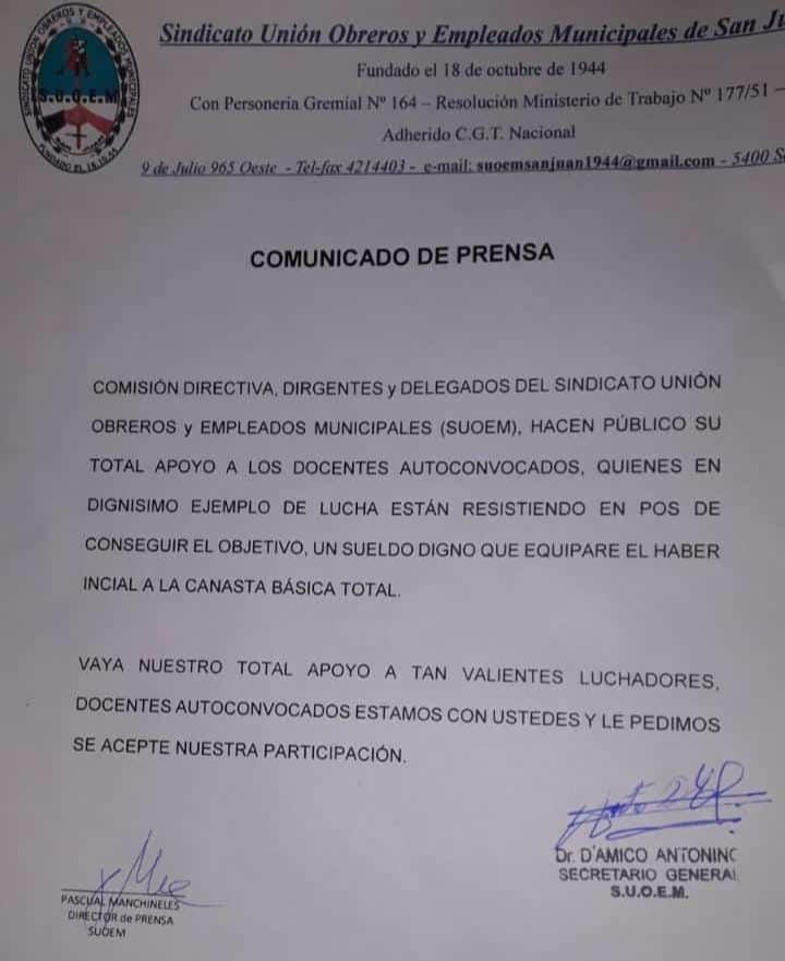 COMISION DIRECTIVA, DIRIGENTES Y DELEGADOS DEL SINDICATO UNION OBREROS Y EMPLEADOS MUNICIPALES (S.U.O.E.M.), HACEN PUBLICO SU TOTAL APOYO A LOS DOCENTES AUTOCONVOCADOS, QUIENES EN DIGNISIMO EJEMPLO DE LUCHA ESTAN RESISTIENDO EN POS DE CONSEGUIR EL OBJETIVO, UN SUELDO DIGNO QUE EQUIPARE EL HABER INICIAL A LA CANASTA BASICA TOTAL.
