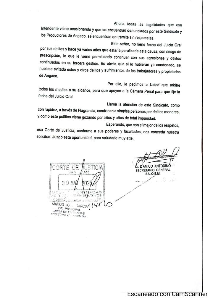 Ahora, todas las ilegalidades que ese Intendente viene ocasionando y que se encuentran denunciados por este Sindicato y los Productores de Angaco, se encuentran en trámite sin respuestas. Este señor, no tiene fecha del Juicio Oral por sus delitos y hace ya varios años que estaría paralizada esta causa, con riesgo de prescripción, lo que le viene permitiendo continuar con sus agresiones y delitos continuados en su tercera gestión. Es obvio, que si lo hubieran ya condenado, se hubiese evitado estos y otros delitos y sufrimientos de los trabajadores y propietarios de Angaco. Por ello, le pedimos a Usted que arbitre todos los medios a su alcance, para que apoyen a la Cámara Penal para que fije la fecha del Juicio Oral. Llama la atención de este Sindicato, como con rapidez, a través de Flagrancia, condenan a simples personas por delitos menores, y como este político viene gozando por años y años de total impunidad. Esperando, que con el mejor de los respetos, esa Corte de Justicia, conforme a sus poderes y facultades, nos conceda nuestra solicitud. Juzgo esta oportunidad, para saludarle muy atte. Dr. D'AMICO ANΤΟΝΙΝΟ SECRETARIO GENERAL S.U.Ο.Ε.Μ.