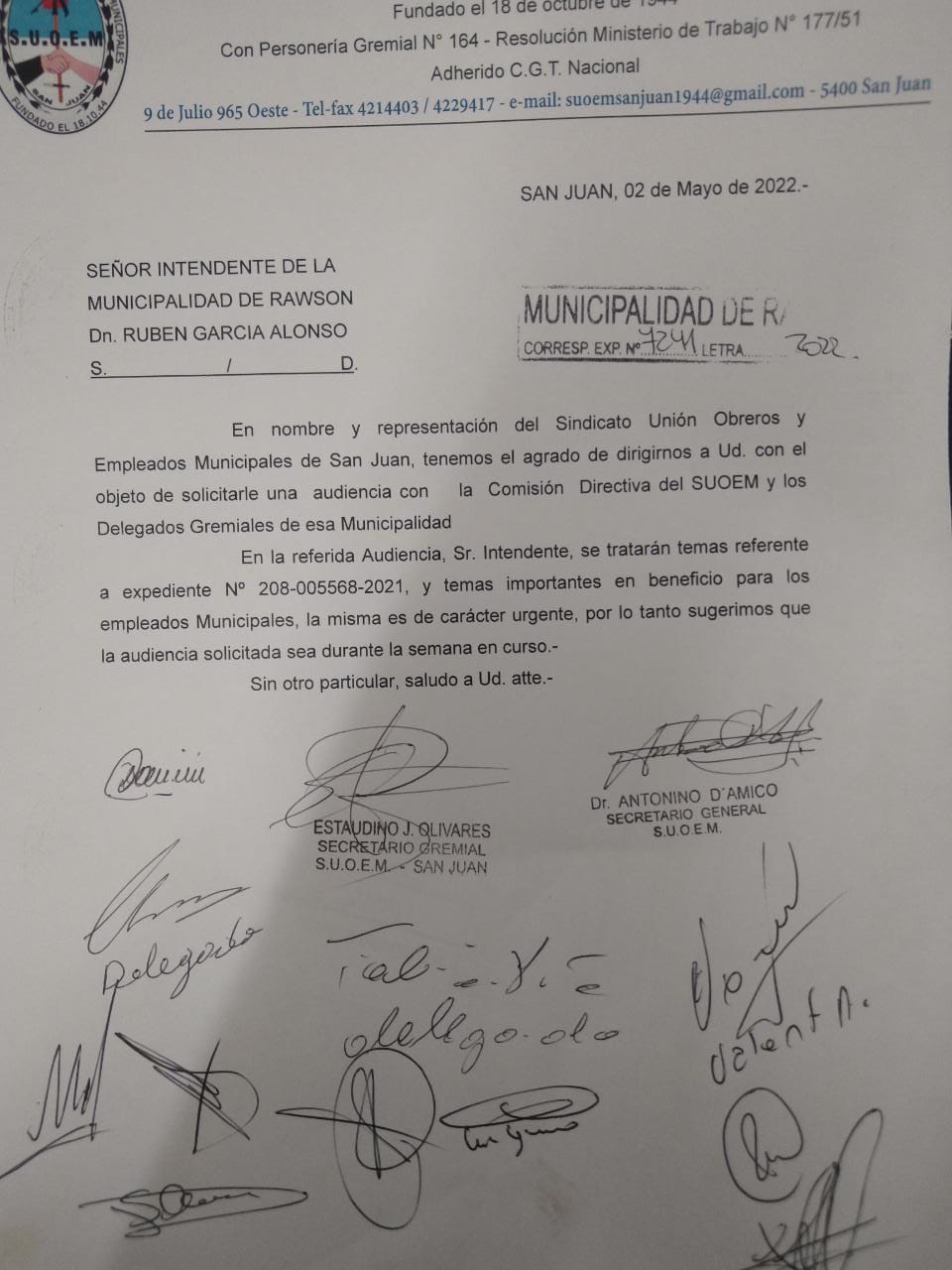 PEDIDO DE AUDIENCIA AL INTENDENTE DE RAWSON