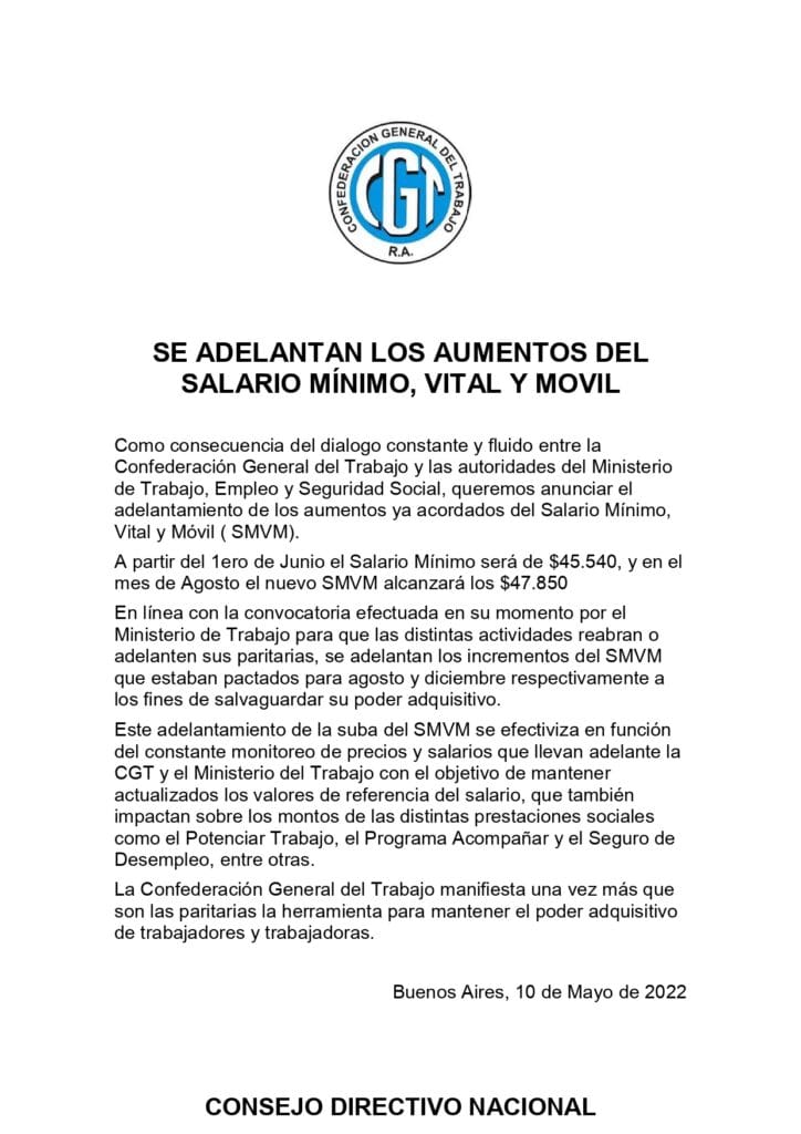 Se adelantan los aumentos del Salario Mínimo Vital y Movil